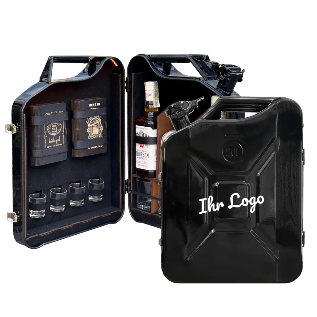 Sie könne unsere Kanister Mini Bar auch auf Ihre Wünsche Personalisieren (mit Ihrem Firma Logo) oder Wüschen.