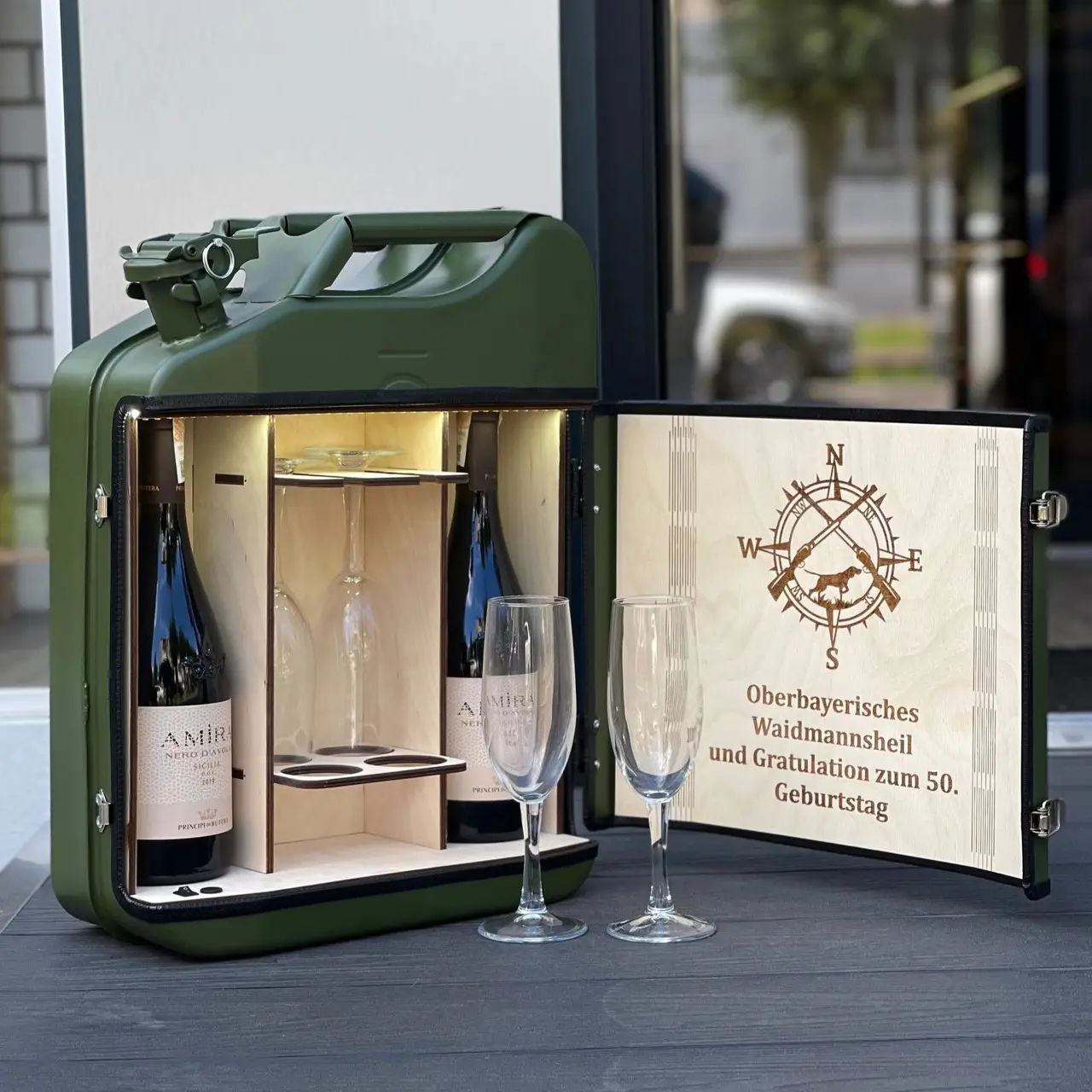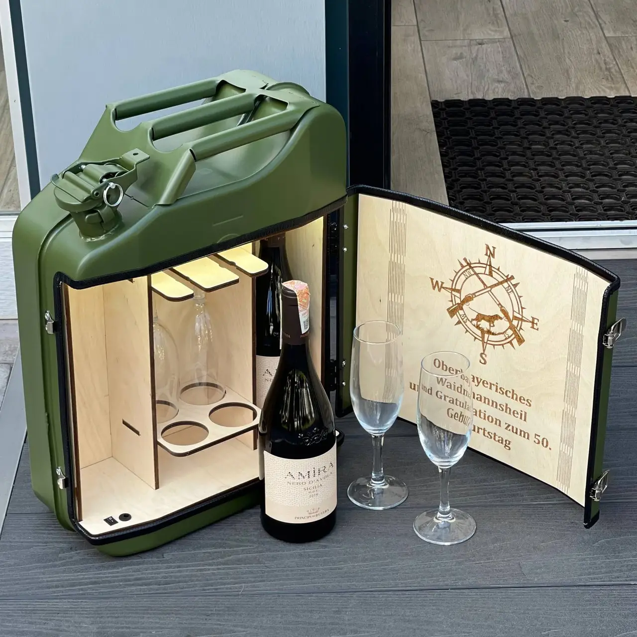 Das innere der Kanister Mini Bar ist mit Stoff und Holz ausgekleidet, damit die Flasche und Gläser geschützt sind.