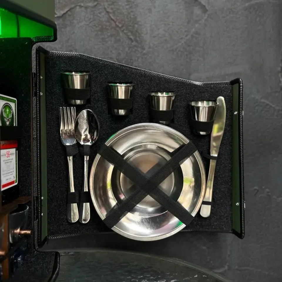 Unsere Mini Bar besteht aus einem 20 Literkanister und umfasst einen Satz Metallgeschirr für 4 Personen. 4 Metall Becher und 4 Gläser.