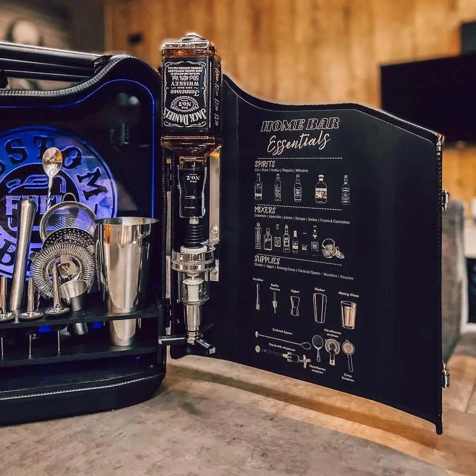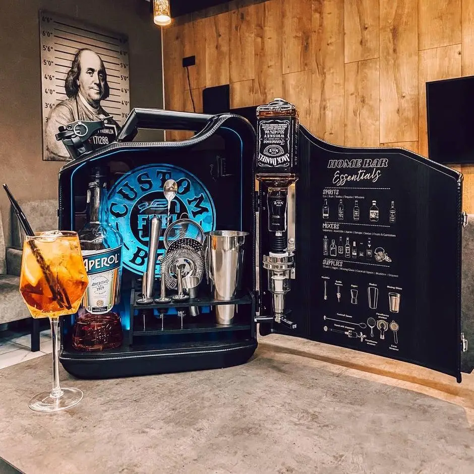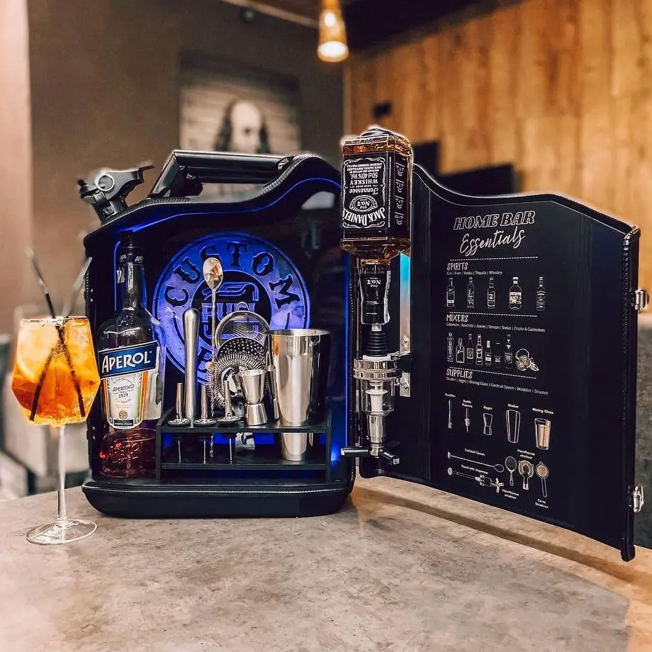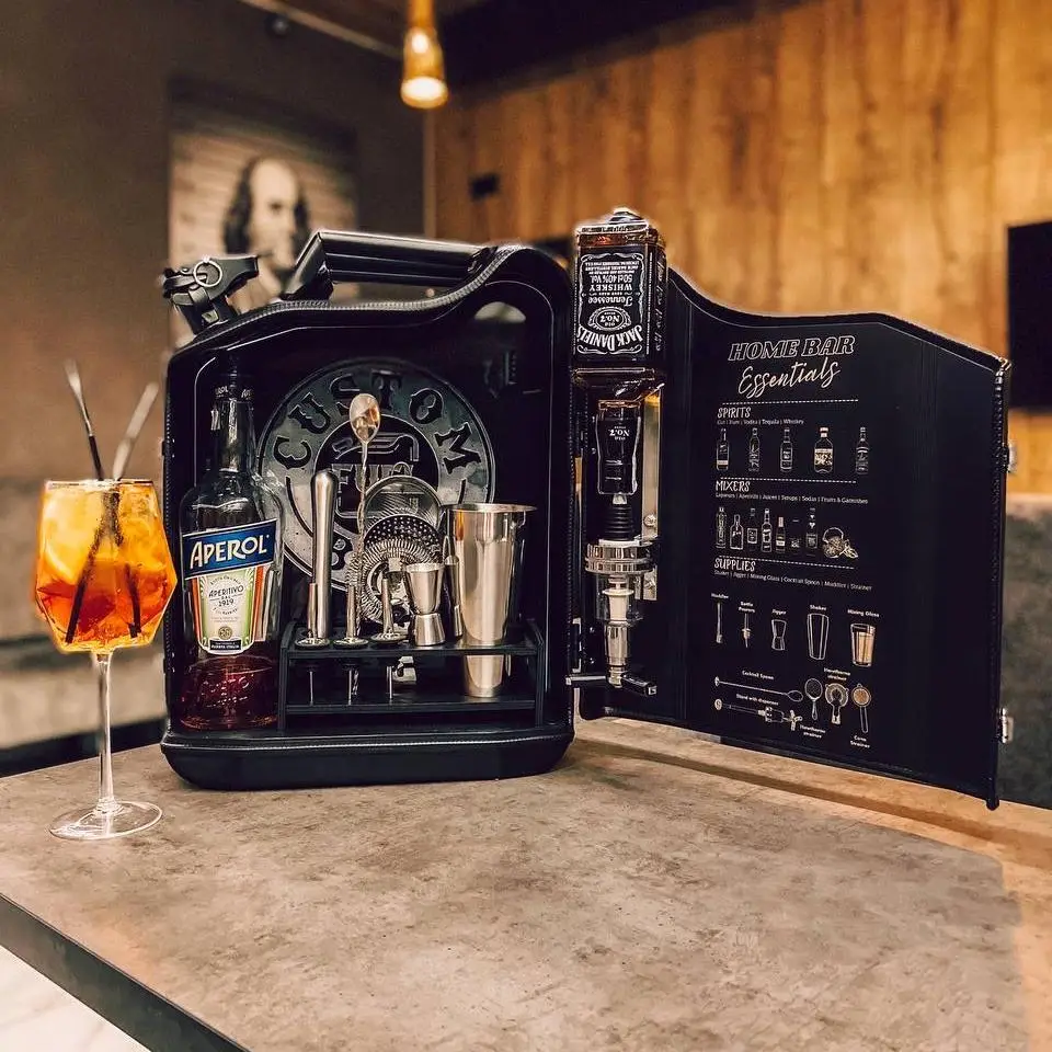 Das innere der Kanister Mini Bar ist mit Stoff und Holz ausgekleidet, damit die Flasche und Gläser geschützt sind.