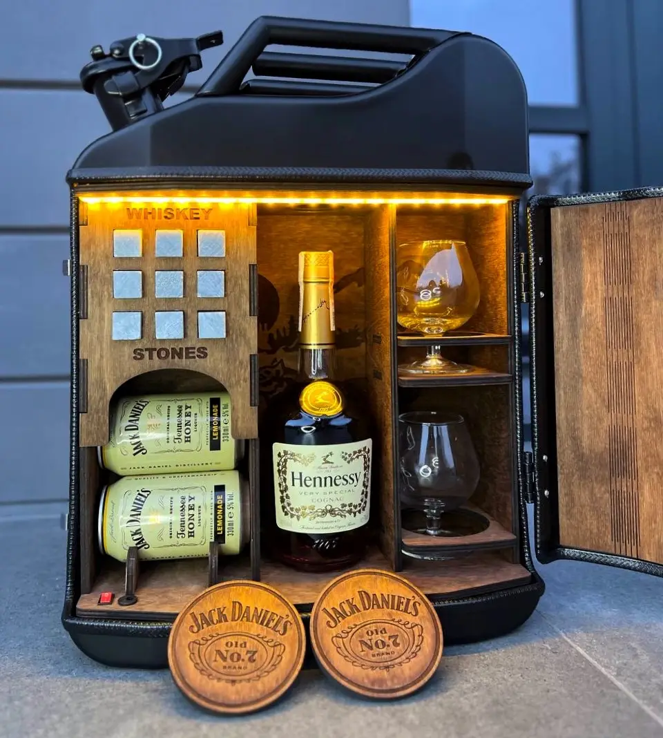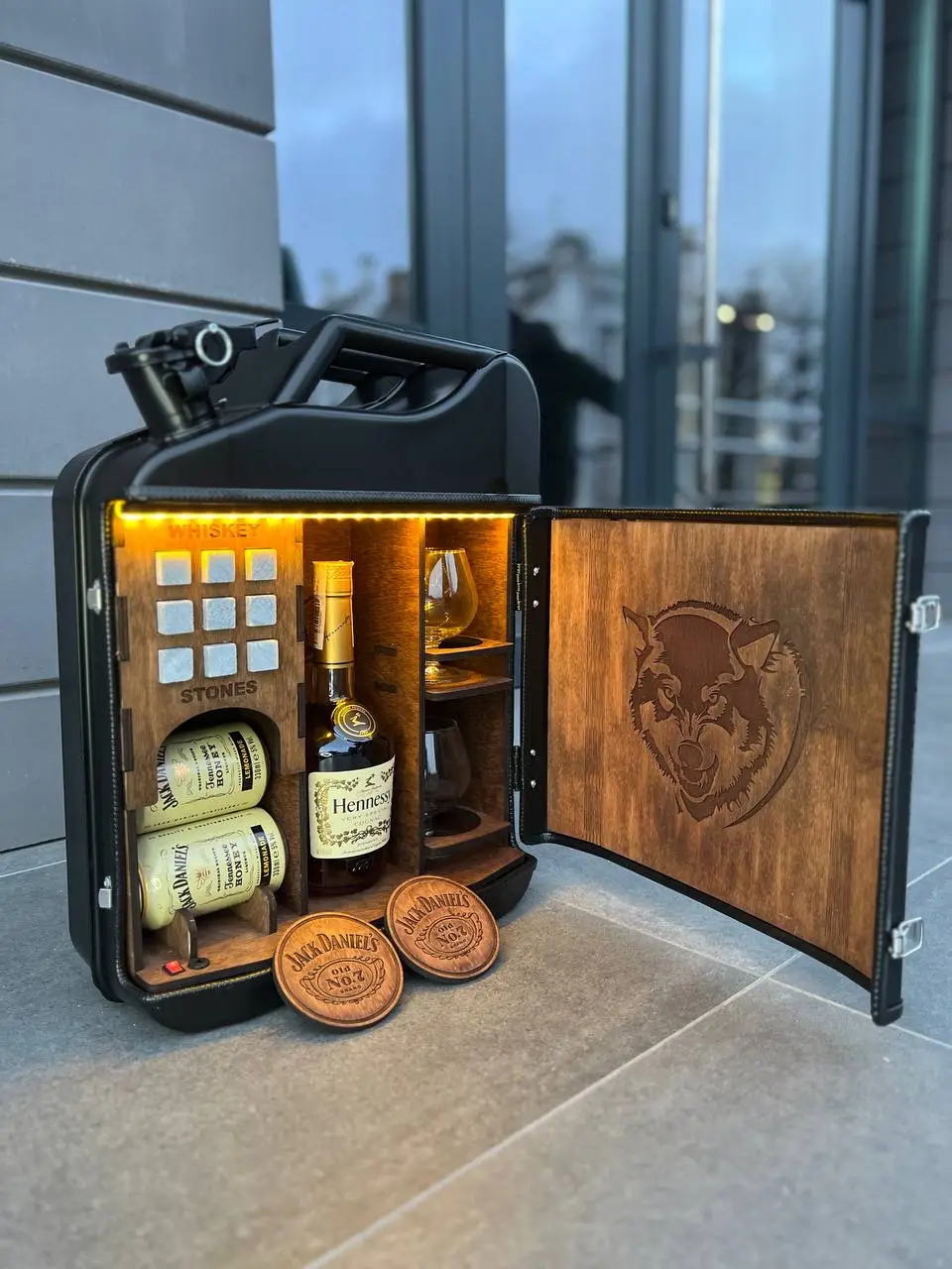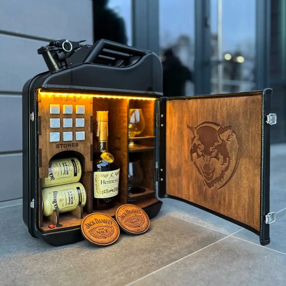 Das innere der Kanister Mini Bar ist mit Stoff und Holz ausgekleidet, damit die Flasche und Gläser geschützt sind.
