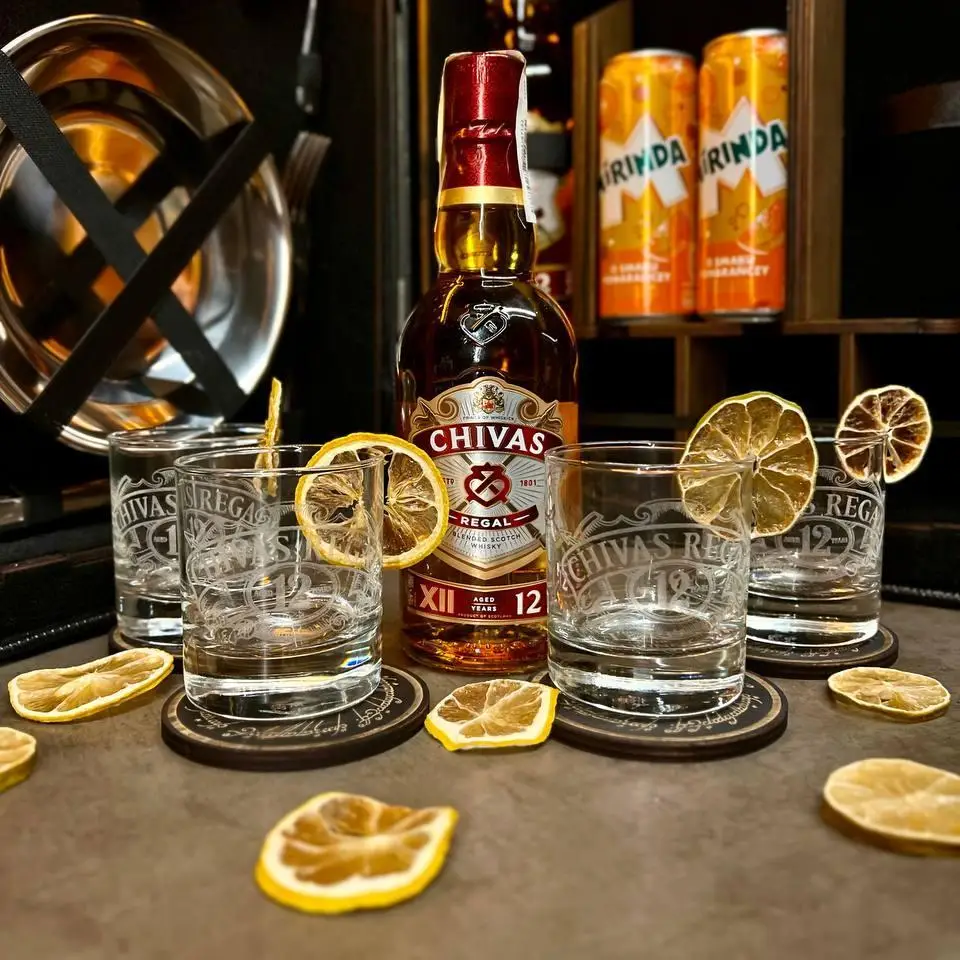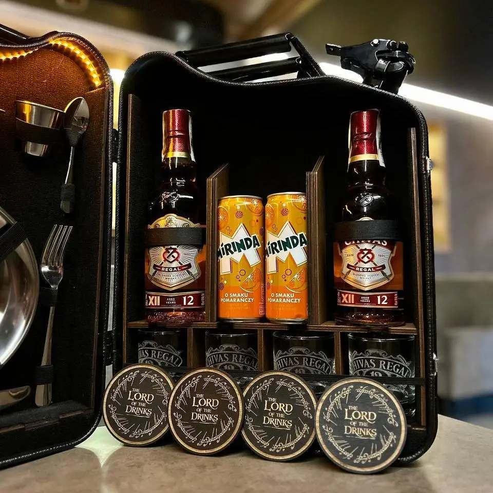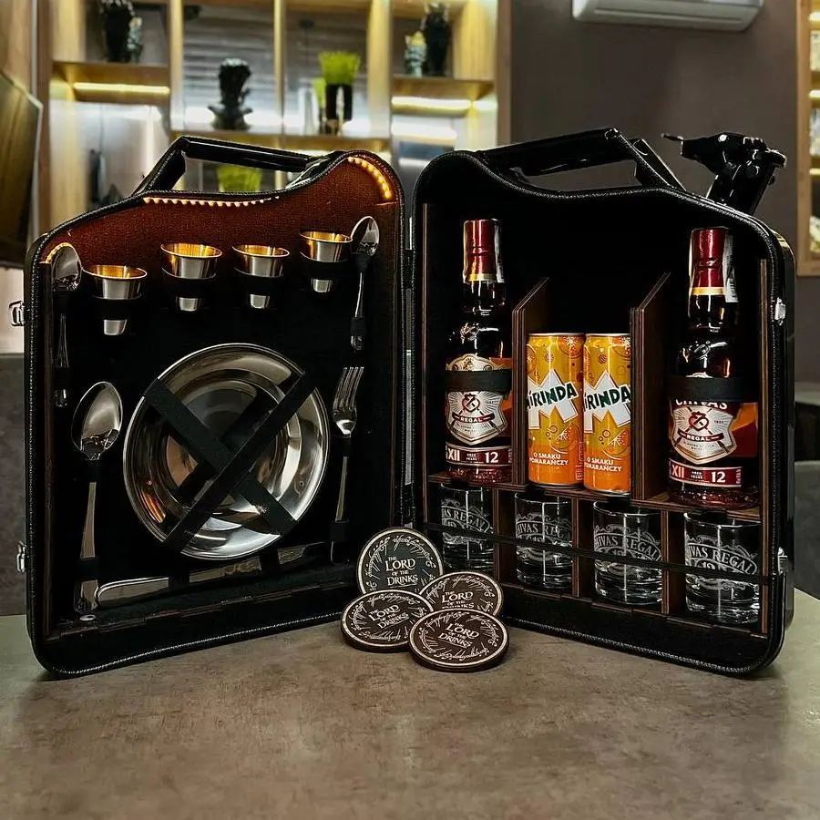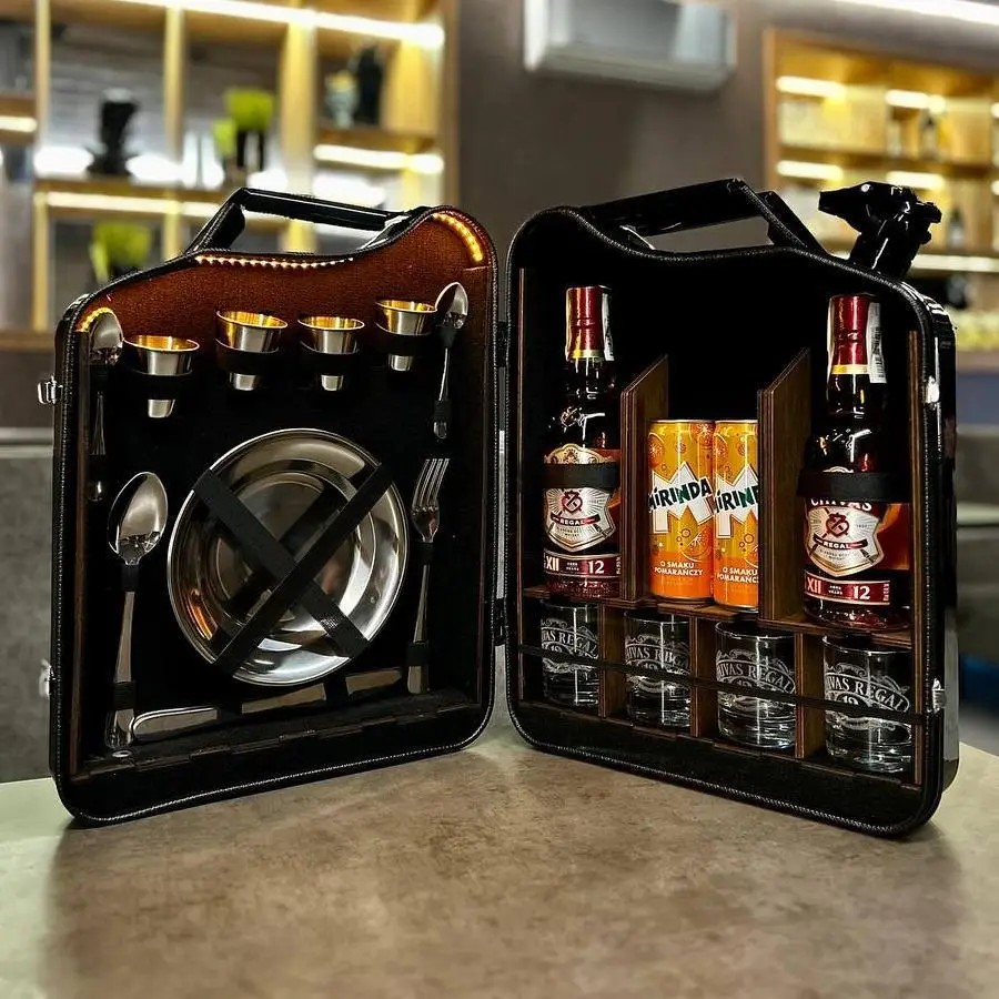 Das innere der Kanister Mini Bar ist mit Stoff und Holz ausgekleidet, damit die Flasche und Gläser geschützt sind.